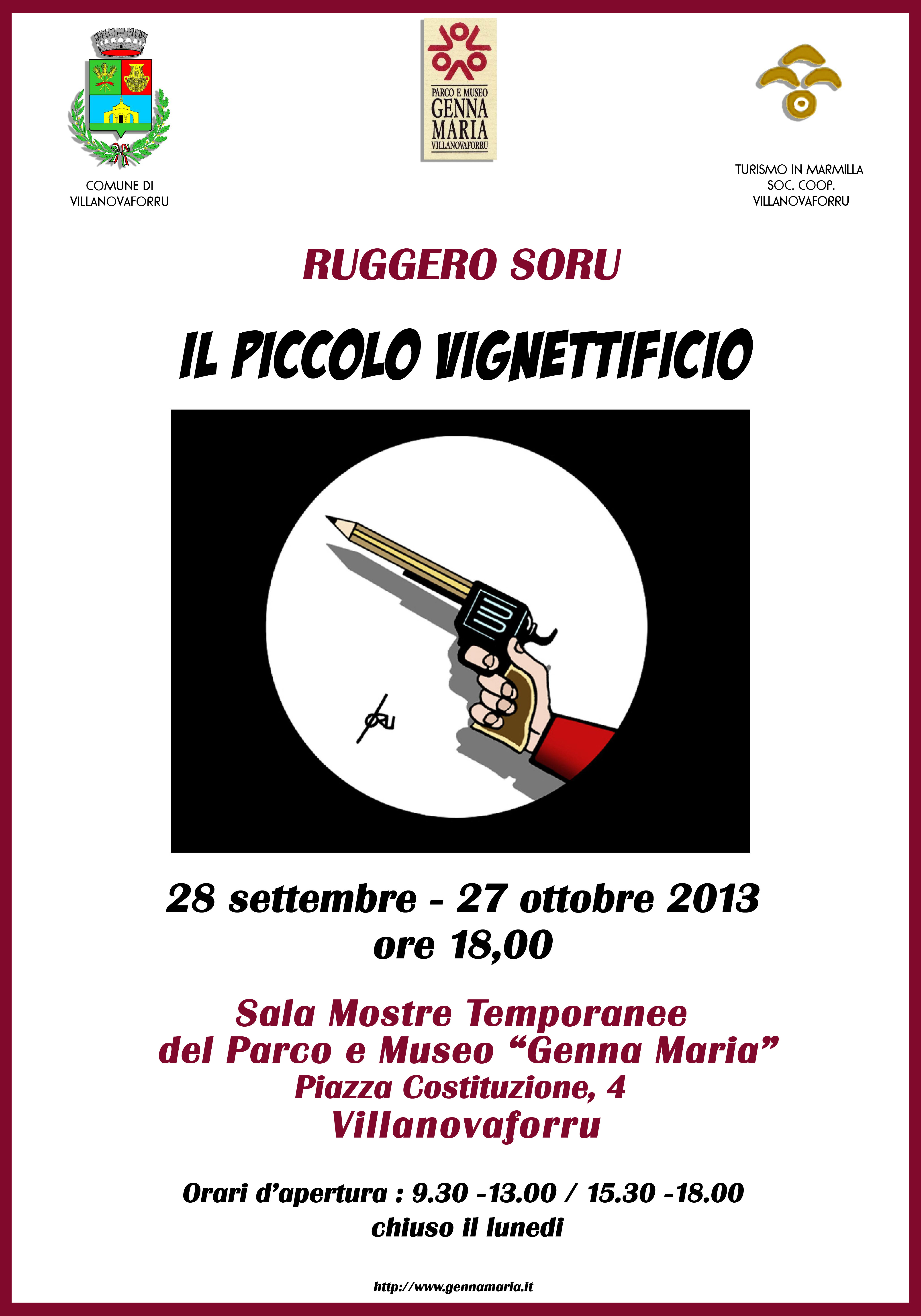Sabato 28 settembre 2013 alle ore 18.00  nei locali della Sala Mostre Temporanee del Museo Civico “Genna Maria” di Villanovaforru si terrà l’inaugurazione della mostra “Il piccolo vignettificio”  di Ruggero Soru, con la collaborazione del Comune di Villanovaforru e della Coop. Turismo in Marmilla.